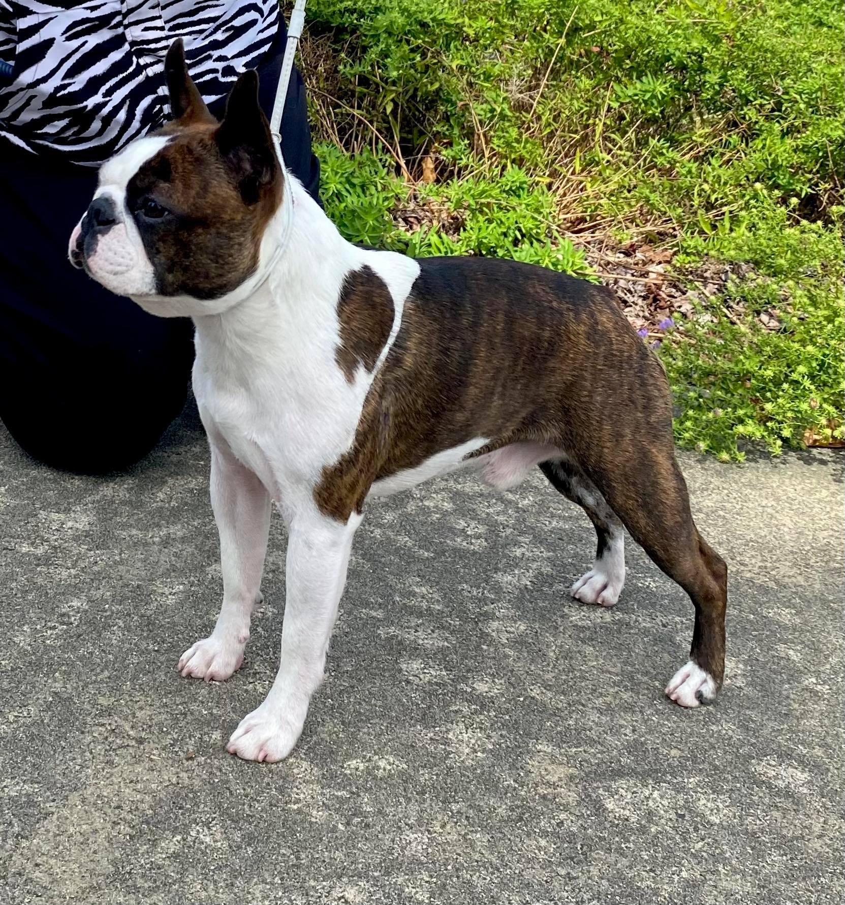 The “Tie-Breaking” Color...Let’s play dog show judge. We present a pop quiz for non–Boston Terrier owners:You have three Boston Terriers in front of you: one is black and white, the dog in the middle is brindle, and the third is seal. You try to find something in each dog that will sway your assessment one way or the other, but they are so comparable that you simply can’t. Which dog do you place first?The AKC breed standard provides the answer. In the section on Color and Markings, it reads: “Brindle is preferred only if all other qualities are equal.”“Equal” is pivotal word here. While it’s rare (in our view) to find three dogs so similar that the “tie breaker” comes down to color – neither is it unheard of. In such a scenario, the judge is directed to place the brindle dog in first place per the breed standard. But why?Let’s first review the color – OOPS! Our bad. Brindle in the Boston Terrier is not a separate color but a pattern expressed on a black-based (eumelanin) coat, produced primarily by the brindle allele at the K locus. It creates alternating dark and lighter bands over the underlying pigment, with the exact appearance influenced by additional genetic interactions and modifiers, while white markings are controlled independently by the spotting locus and don’t influence whether a dog is black, seal, or brindle.To our knowledge, seal and black share the same black pigment, with seal appearing brownish or reddish in strong light due to currently undefined or incompletely mapped modifiers that affect how densely the black pigment is expressed; brindle specifically requires the brindle-pattern allele – without it, a black-based Boston will look solid black or seal instead of striped.Because brindle depends on this distinct genetic variant, it can be readily diminished if breeders select only for solid black or seal. Again, as far as we know, once largely bred out, it is difficult to recover without deliberately reintroducing the allele, which can help explain why early and historically careful Boston Terrier breeders emphasized and preserved brindle. It wasn’t just to maintain not the traditional look of the breed, but also to keep allelic diversity at the K locu instead of narrowing the gene pool to a single solid black expression. Interestingly, early breeders seemed to know to do this in their pre-genetic testing era.In short, brindle is preferred in the Boston Terrier standard not because it’s rarer or prettier, but because it is historically correct and genetically tied to the breed’s origin and type.Let’s remember that early Boston Terriers were overwhelmingly brindle with white markings. The foundation dogs of the breed—most notably Hooper’s Judge—were brindle, and for decades brindle was the dominant and defining color of the “American Gentleman.” As solid black dogs became more common through selective breeding, the parent club retained a preference for brindle to help preserve the breed’s original look and prevent drift toward a more generic black-and-white dog that could resemble other small companion breeds.Importantly, the wording that “brindle is preferred only if all other qualities are equal” makes clear that brindle confers no advantage over a dog that is superior in structure, balance, expression, or temperament. The preference is included in the standard solely to honor and preserve historical breed type. It is a nod, so to speak, to the Boston Terrier’s roots, but they are never to supercede soundness, structure and type.